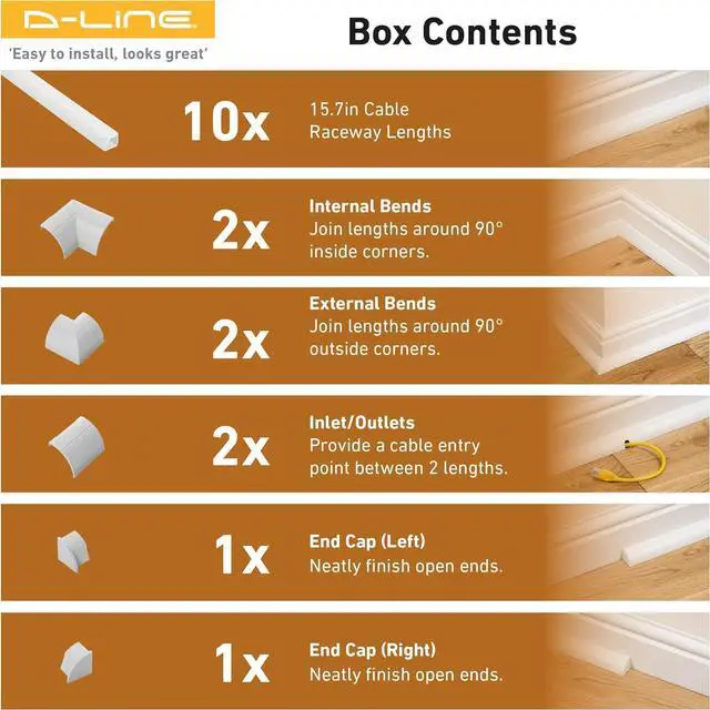 Each pack includes: 10x D-Line White Cable Raceway 0.87" (W) x 0.87" (H) x 15.7" Lengths (157in total coverage), 2x External Bends, 2x Internal Bends, 2x Cable Inlet/Outlet, 9x Connectors, 1x End Cap (Left), 1x End Cap (Right)
