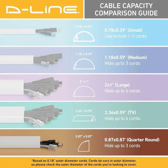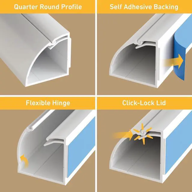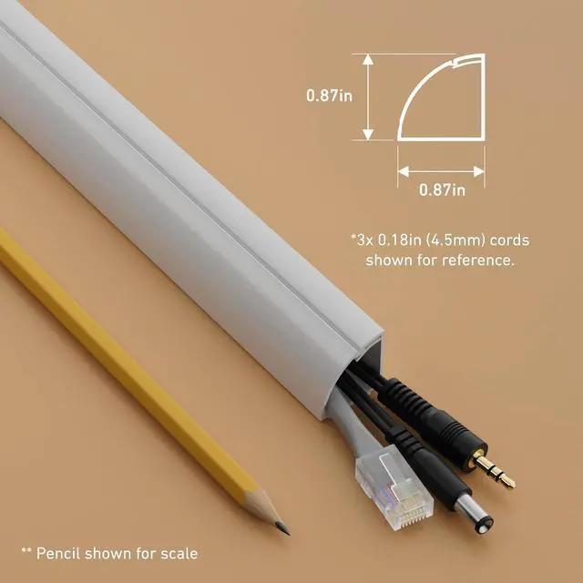 D-Line White Cable Raceway 0.87" (W) x 0.87" (H) Multipack - 10x 15.7in Lengths & 17x Accessories, use accessories to cover cords around a variety of most popular angles. Quarter Round cord cover blends with décor, providing a neat solution to hide cords in the corner of rooms. Popular to cover cords around floor perimeters, with the profile scaling well with popular baseboard heights, one-piece design with hinged lid gives easy cable access... great when appliances are upgraded!