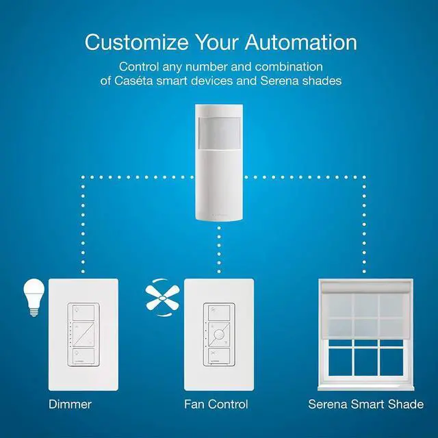 Add enhanced automation to your Caseta dimmers, switches, and fan controls with your Caseta Motion Sensor. Program your Caseta Motion Sensor as an occupancy or vacancy sensor to automatically control any number of Caseta devices when you enter or leave a room. One motion sensor can control many Caseta devices within up to 60 ft. and can detect motion three times better than other comparative sensors. The motion sensor features a full 180° field of view, in addition to having a typical 10 year battery life, three times longer than the industry average. Use the motion sensor for occupancy or vacancy applications wherever it's needed - no wires required. Place it freestanding on a flat surface or mount to a wall or corner; this makes the motion sensor perfect for bathrooms, laundry rooms, hallways, garages, and more. Place in a high traffic area of your home for hands-free control of your lights; alternatively, place in a low traffic area of your home so you never have to remember if you turned the lights off. Set your desired light level on each device controlled by your sensor for further customization; when the sensor switches on, it will automatically turn your devices on to the preset level.