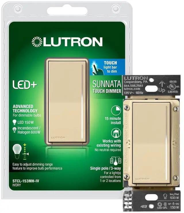 Introducing the Sunnata touch LED+ dimmable switch with LED+ Technology. This decorator-style ivory light switch features a rocker light switch to turn lights On/Off and a sleek touch bar to dim/brighten your lights. Use with the new Sunnata accessory switch (ST-ASR-xx) to match aesthetics in a 3-way application, where lights are controlled from two or more locations. Also use with a mechanical on/off electrical switch to create a 3-way application if desired. No Neutral Required. Wall plate sold separately.