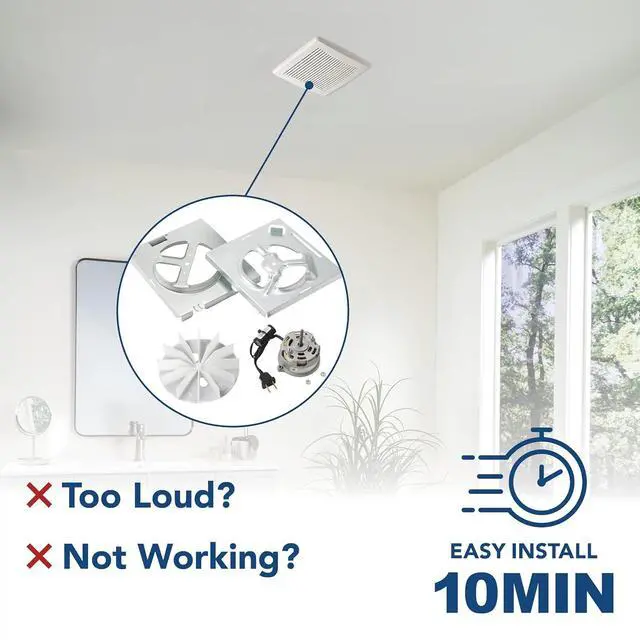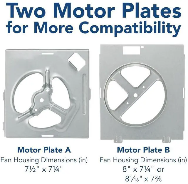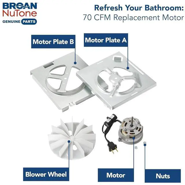 Quickly improve the indoor air quality in your bathroom with the Broan-NuTone Bath Fan Replacement Motor Kit. This bath fan motor is a direct replacement for select Broan-NuTone 70 CFM fans and delivers up to 40% more power for select 50 CFM fans, keeping the air in your bathroom fresh. The motor operates with 6.0 sones and provides sufficient ventilation that quickly and efficiently removes odors and moisture from your bathroom to deliver the quality of air you and your family deserve. Requiring no wiring and no drywall cutting or repair, this easy DIY bath fan motor kit allows you to replace your existing motor in just 10 minutes or less. It's a quick and simple solution to a bathroom exhaust fan that is no longer working properly, is too noisy, or is simply in need of an upgrade. This kit contains Genuine Broan-NuTone replacement parts, guaranteed to fit, including a motor, blower wheel, 2 motor mounting plates, and hardware for installation. All ratings are designed, tested, and certified to ensure your product runs at peak performance.