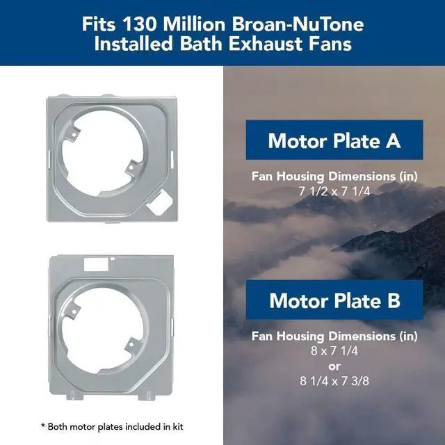 UNIVERSAL FIT: BKR60 Genuine Broan-NuTone replacement parts ensure a seamless fit and optimal performance for your bathroom fan, grill product measures 10 3/4 x 9 3/8 x 1/4, fitting over 130 million installed previously installed fans. 2 motor plates are included so you can select the best fit. Motor plate A measures (inches) 7 1/2 x 7 1/4. Motor plate B measures (inches) 8 x 7 1/4