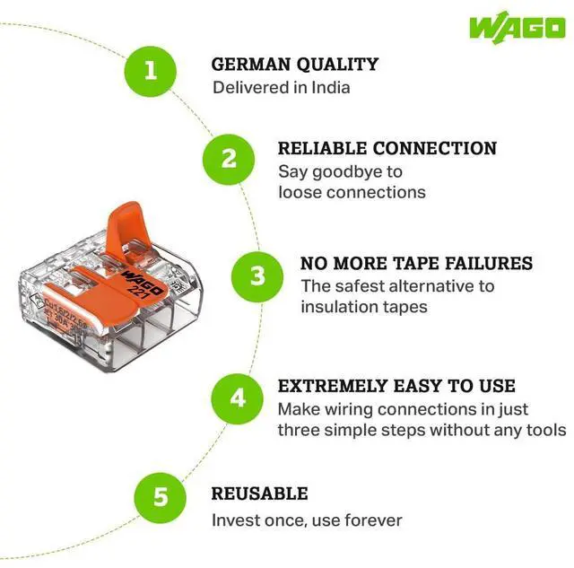 Connect solid, stranded, and flexible copper wires upto 4sqmm faster and more reliably for safe wiring connections