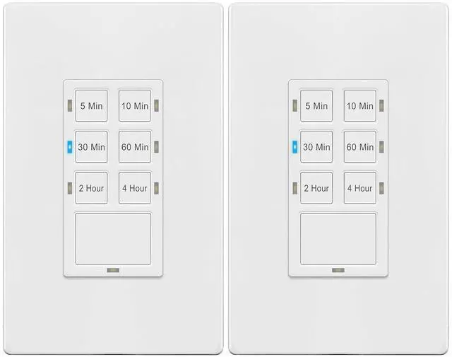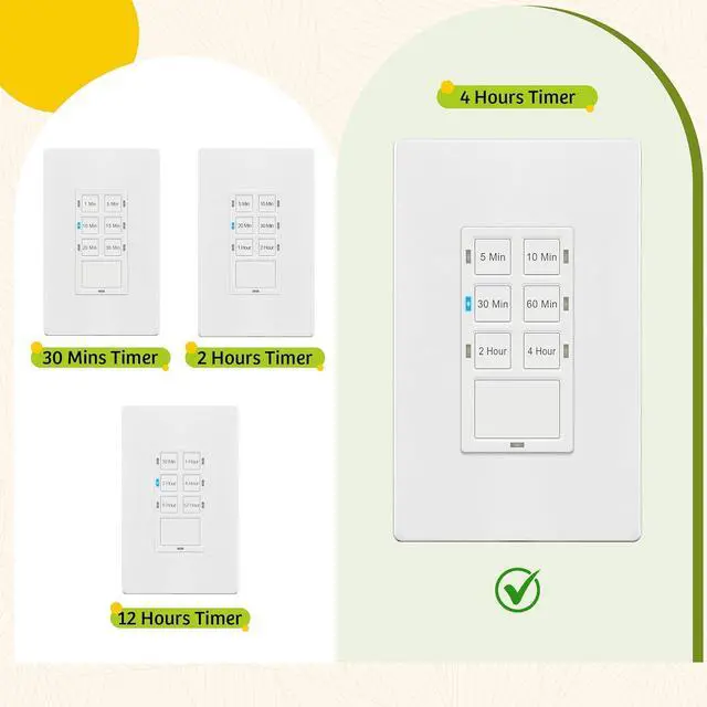 • Countdown Timer: Six preset countdown time options: 5, 10, 30 or 60 mins, 2 or 4 hrs; Bottom button for re-set. Replaces any standard wall switch, fits any standard decorator wall plate