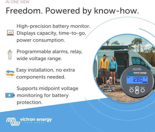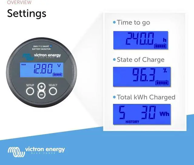 Displays % State of Charge, Voltage, Current, Energy/Time remaining, and more. View historical data and charts in Victron Connect. Easy to Program for initial setup on the display or via bluetooth