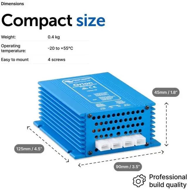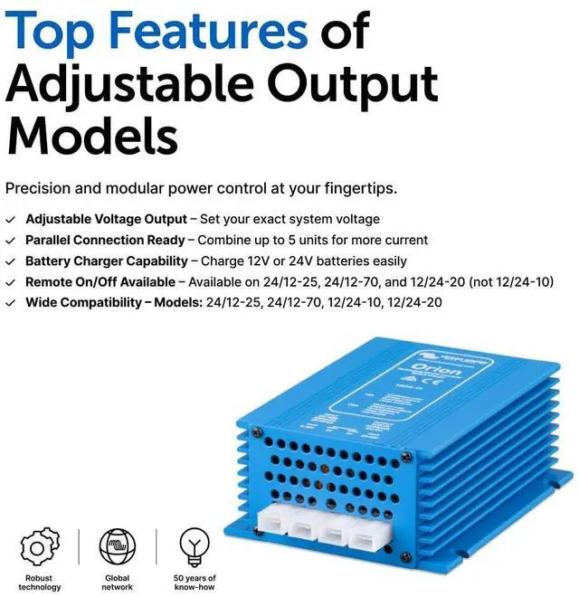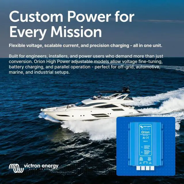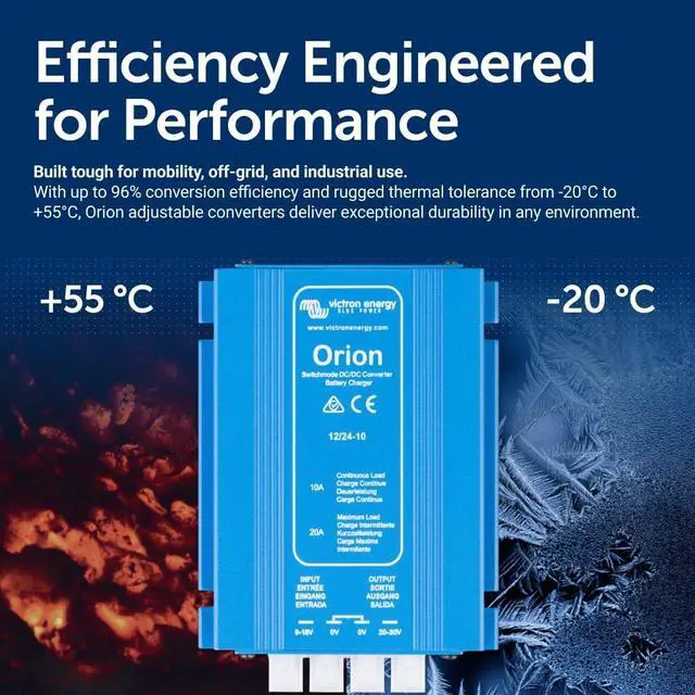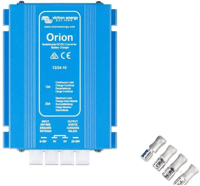 Victron Energy Orion Non Isolated DC-DC Converter converts voltage from DC 12-Volt (9-Volt - 18-Volt) to DC 24-Volt (20-Volt - 30-Volt) with a 10 amp output and 95% high conversion efficiency