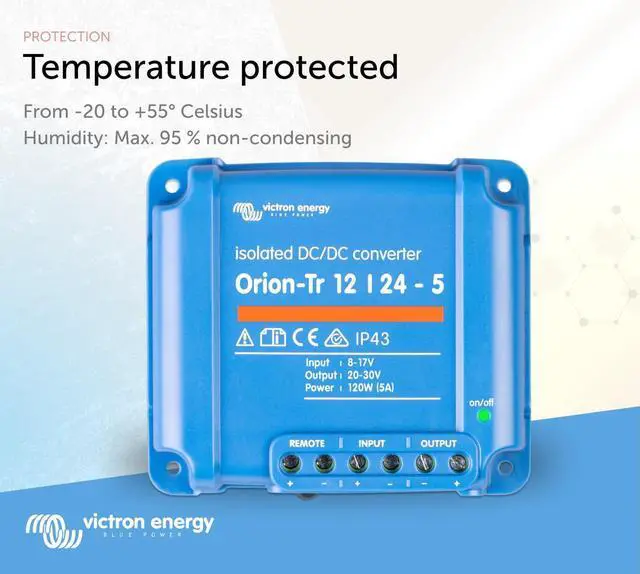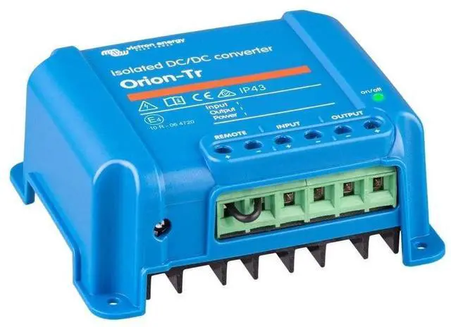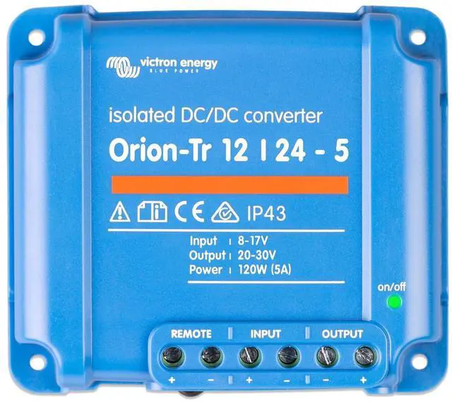 The Victron Energy Orion-Tr DC-DC Isolated Converter converts voltage from 12 to 24-Volt with a 5 amp and 120-Watt output and is IP43 protected