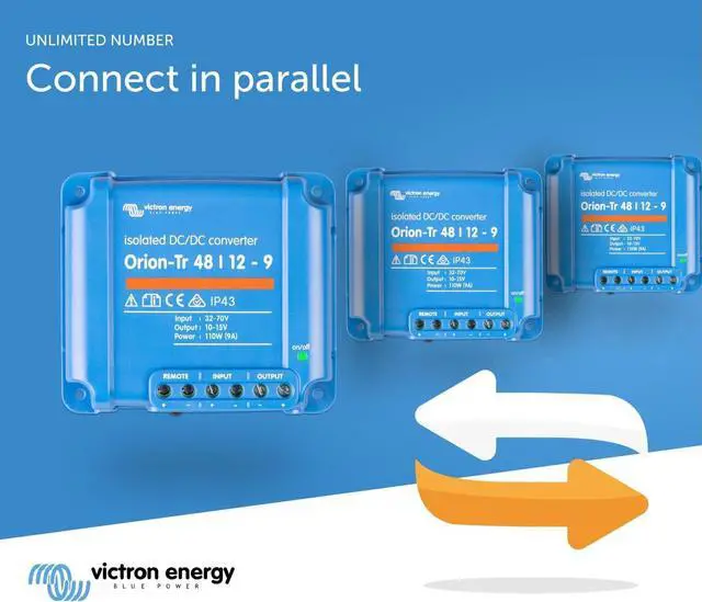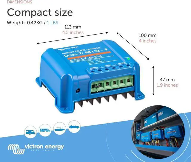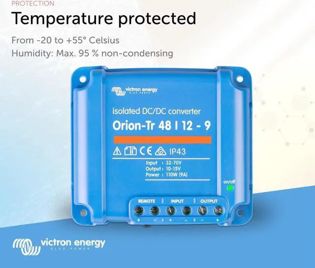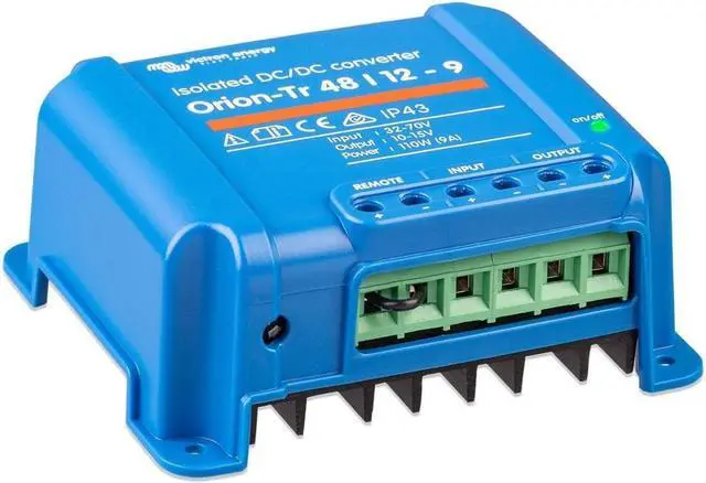 The Victron Energy Orion-Tr DC-DC Isolated Converter converts voltage from 48 to 12-Volt with a 9 amp and 110-Watt output and is IP43 protected