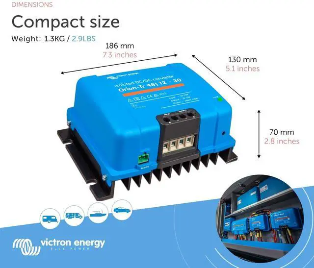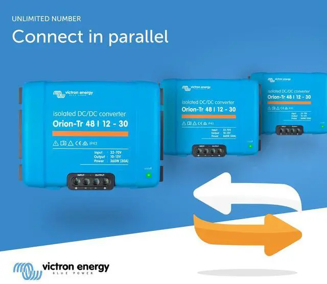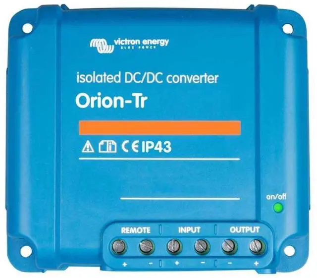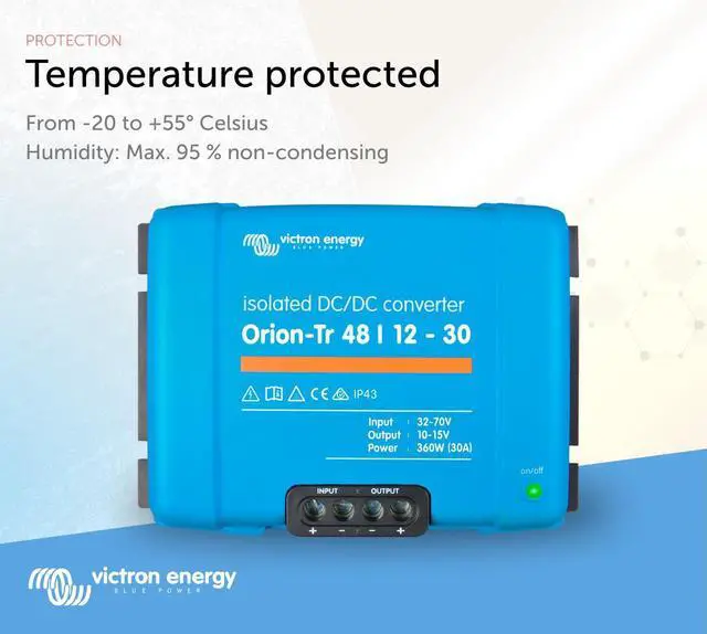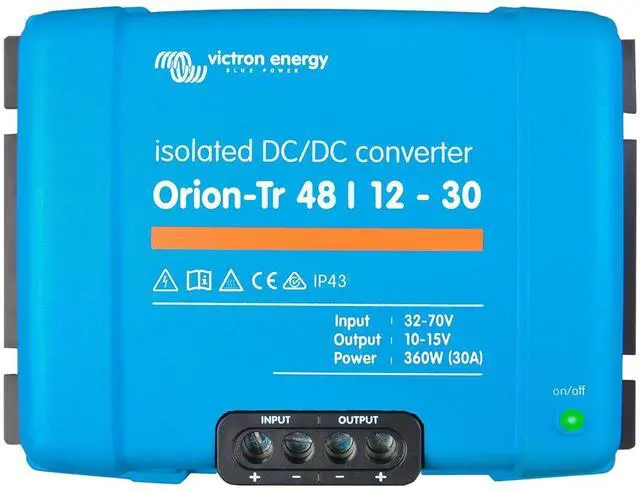 The Victron Energy Orion-Tr DC-DC Isolated Converter converts voltage from 48 to 12-Volt with a 30 amp and 360-Watt output and is IP43 protected