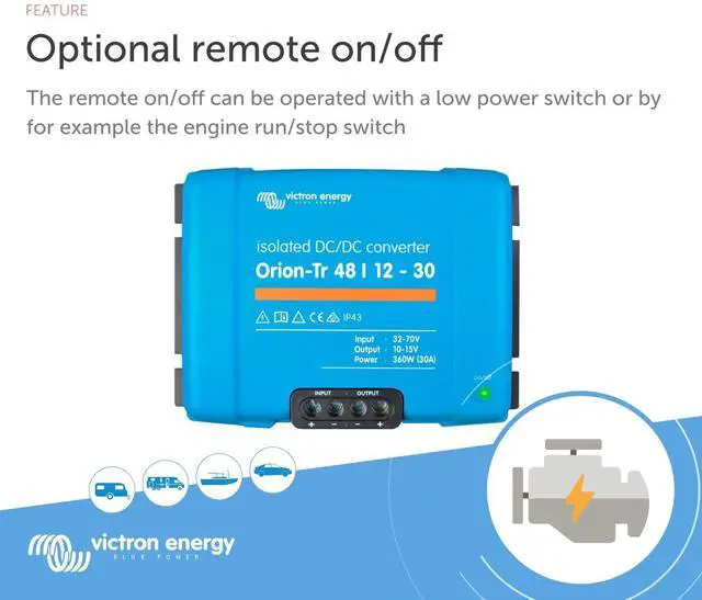 The remote on-off connector eliminates the need for a high current switch in the input wiring, the remote on-off can be operated with a low power switch or by the engine run/stop switch