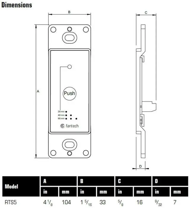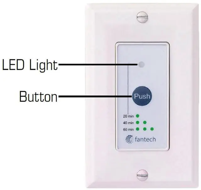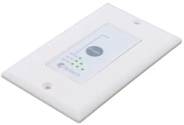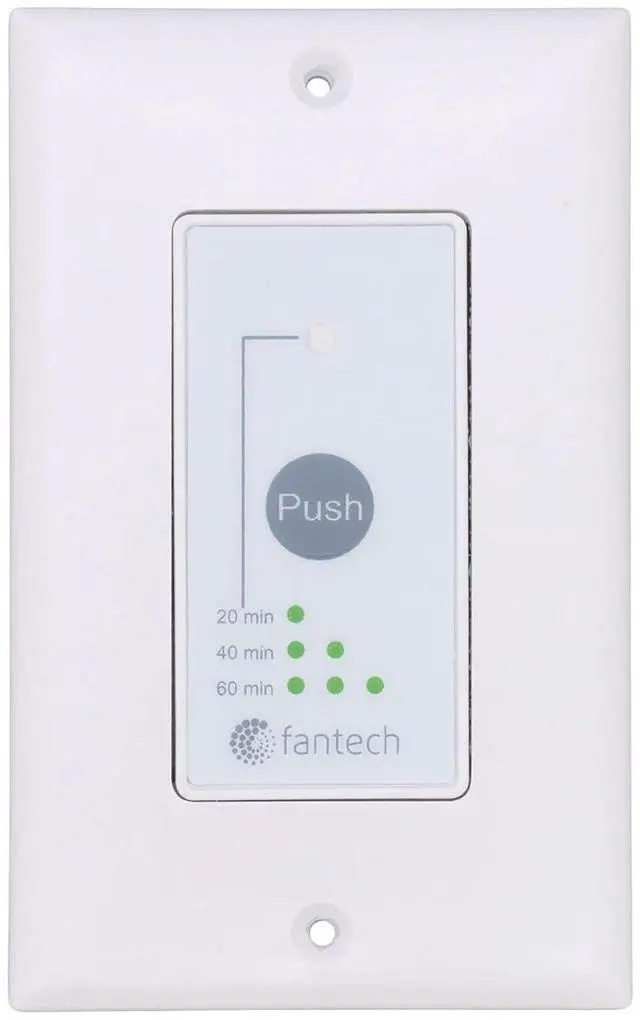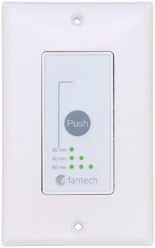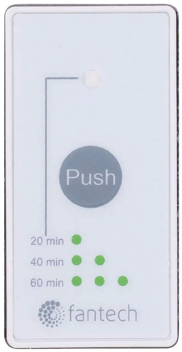 The RTS5 is compatible with Fantech Flex 100H, VHR70R, VHR100R, VHR150 and VHR150R. The push button activates the system to run in continuous mode for 20, 40 or 60 minutes, it then returns to the predetermined setting. To cancel this operation, simply press the button a fourth time.
