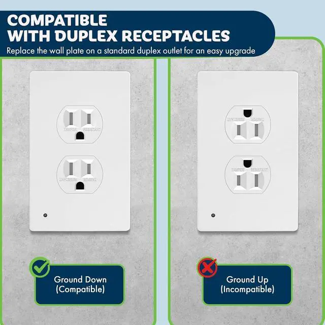 STANDARD DUPLEX ONLY; Compitable with standard ground down duplex outlet ONLY (see product image), NOT FOR GFCI or other styles; mid-size dimensions: H 4.88" (12.4cm) x L 3.11" (7.9cm)