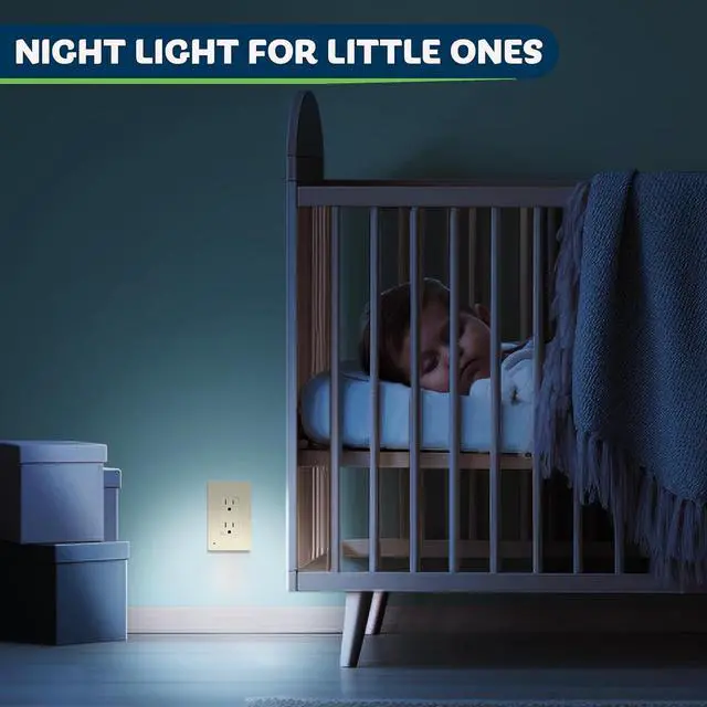 Guide light duplex wall plate features a thin LED aimed downward to act as both a guiding light and a comforting night light for small children; perfect for dark hallways, stairways, restrooms, nurseries, or children's bedrooms