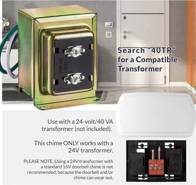 COMPATIBILITY: Our hard-wired door chime can be used with a 24V transformer (not included) ONLY (it will not work with any other voltage transformer). Search 40TR for a compatible transformer. Using a 24V transformer with a standard 16V doorbell chime is not recommended, because the doorbell and/or chime can wear out.