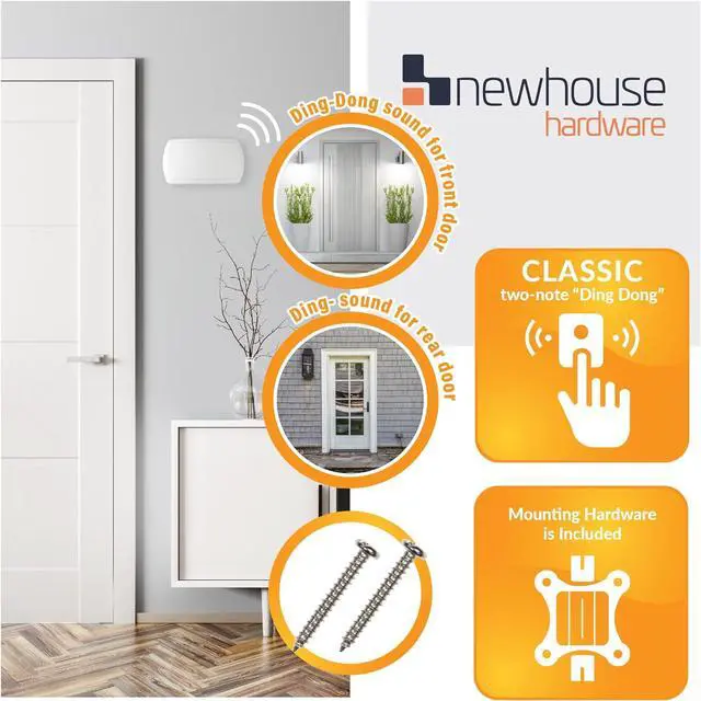 FAMILIAR TONES: Our Newhouse Hardware Wired Doorbell Chime uses the classic two-note "Ding Dong" sound for the front door button and has an additional connection with a separate"Ding" for the rear or side door.