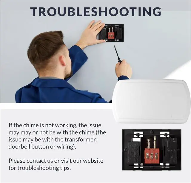 TROUBLESHOOTING: If the chime is not working, the issue may or may not be with the chime. The issue may be with the transformer, doorbell button or wiring. Please contact us or visit our website for troubleshooting tips.