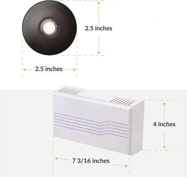 Door chime measures at 7-3/16 in. W and 4 in. H, door bell button measures at 2.5 in. x 2.5 in.
