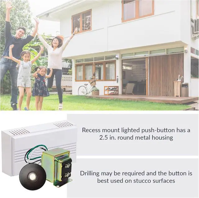 Recess mount lighted push-button has a 2.5 in. round metal housing, drilling may be required and the button is best used on stucco surfaces