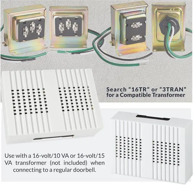 COMPATIBILITY: Use with a 16-volt/10 VA or 16-volt/15 VA transformer (not included) when connecting to a regular doorbell. Search 16TR or "3TRAN" for a compatible transformer.