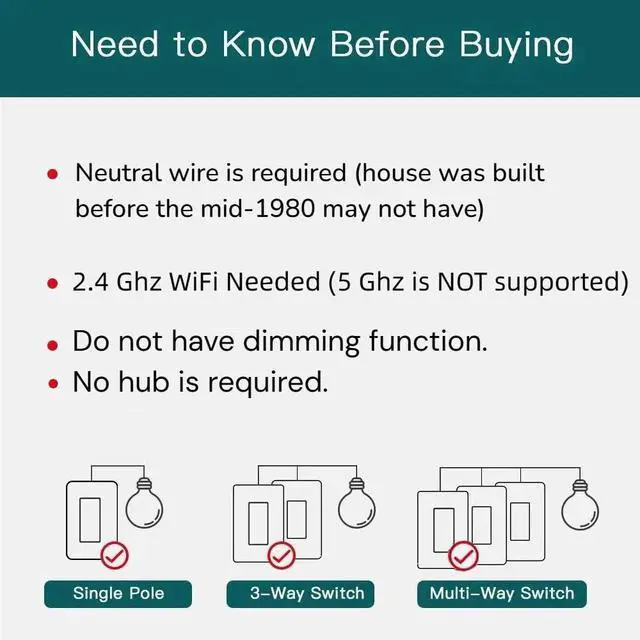 Easy To Install: Step-by-step instructions will guide you through the wiring process. Neutral Wire is required; standard size; screwless snap-on wall plate; no hub required. For 2.4G Wi-Fi only (NOT 5G). Max Power: 1250W. Output Current: 10A. For non-dimmable bulbs. DO NOT require one on each end of the switch