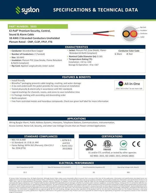 Applications: Wiring Burglar Alarm, Public Address Systems, Intercoms, Telephone Stations, Communications, Instrumentation, Access Control, Nurse Call, Security and Other Low Voltage Circuits that are Power-Limited Applications.