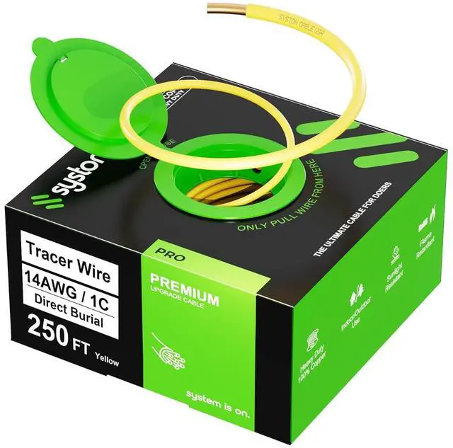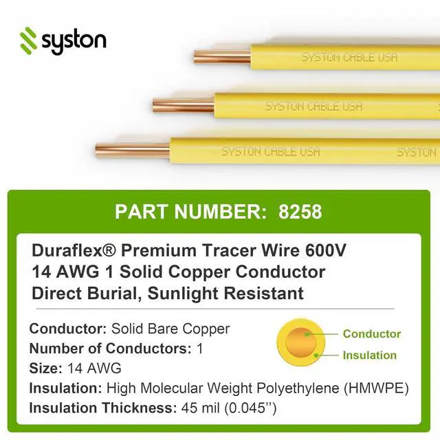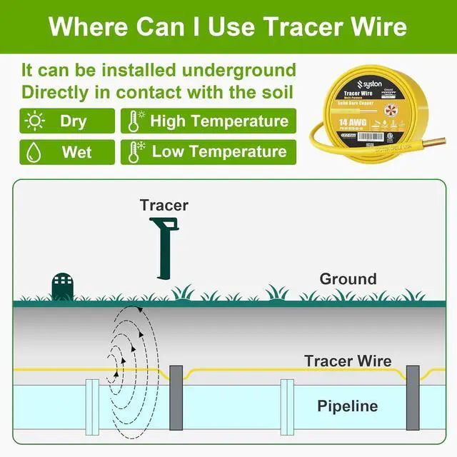 Versatile applications. Underground tracer wire is used to accurately locate underground pipes and lines. Color code: Yellow for gaseous materials; Red for electrical lines; Blue for potable water.