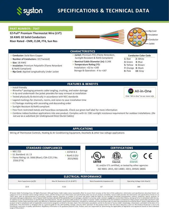 Pure Copper Conductors: Our thermostat cable is built with solid pure copper conductors, providing maximum conductivity and reliability to ensure that your systems run smoothly.