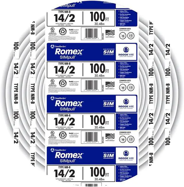 Southwire Romex Brand Simpull Solid Indoor 14/2 W/G NMB Cable 100ft Coil - SW# 28827423