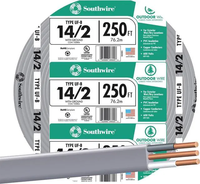 • 14 Gauge, 2 Conductor 250ft Copper UF-B Cable