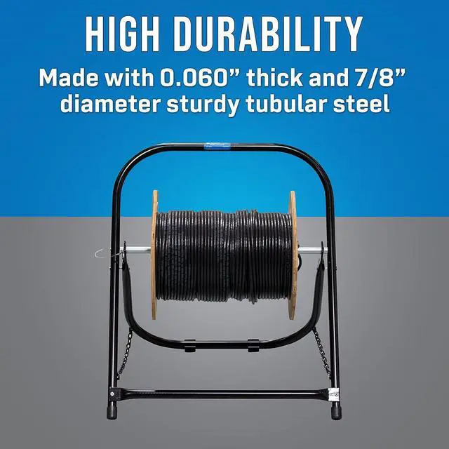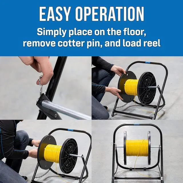 EASY OPERATION: Easy to set up by just placing Cable Caddy on floor, removing cotter pin, and loading reel. Able to firmly hold cable reels weighing up to 100 lb and measuring up to 20 diameter and 17 height