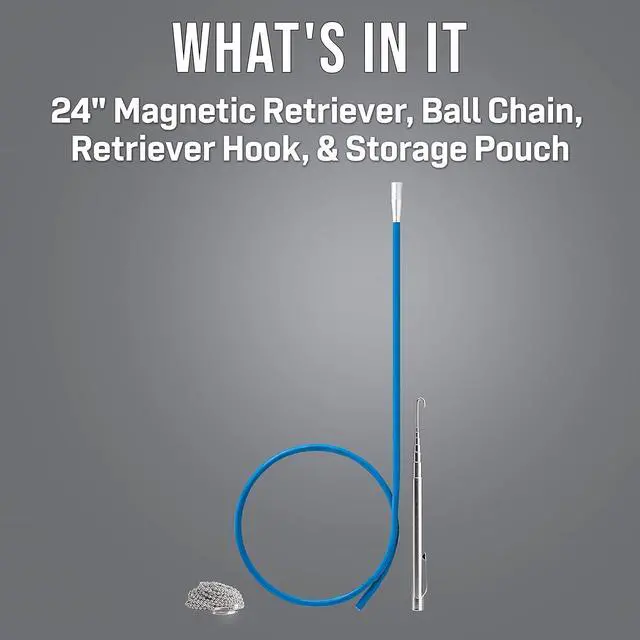 WHAT'S IN IT: 24 flexible magnetic retriever, 10 ball chain with 3/4 diameter stop ring, MRS-RH20 expandable retrieval hook, and storage pouch