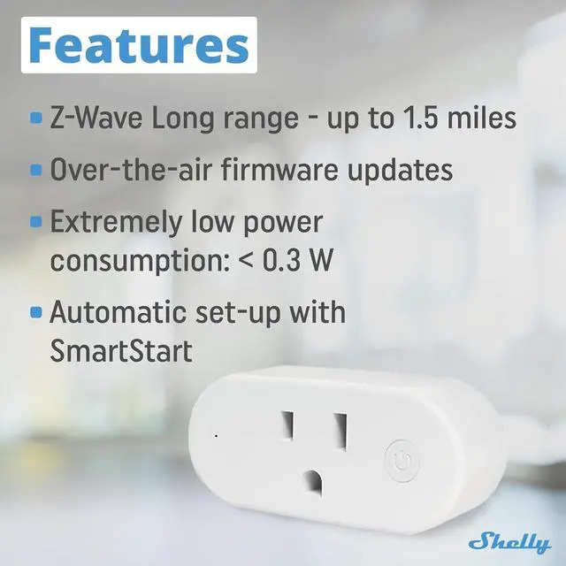 Shelly Wave Plug US LR is a Z-Wave Long range smart plug that enables automation and remote control of any connected electrical appliance at home while also monitoring its power consumption. Works with any Z-Wave Gateway and has an extremely low power consumption < 0.3 W. *A gateway (smart hub) is not included. A gateway (smart hub) is required for the configuration of the device.