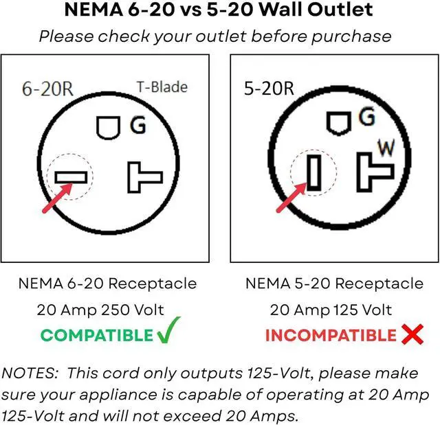 NOTES: This cord only outputs 125-Volt, please make sure your appliance is capable of operating at 20 Amp 125-Volt and will not exceed 20 Amps.