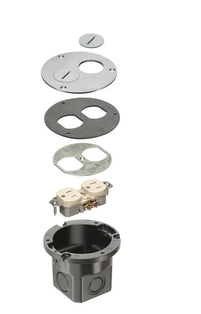 Flush to floor round cut in floor box kit Two threaded screw plugs Available in Brass or Nickel Plated Covers Easy to install in existing WOOD or CONCRETE floors Provided flush floor box with two 15 amp outlets
