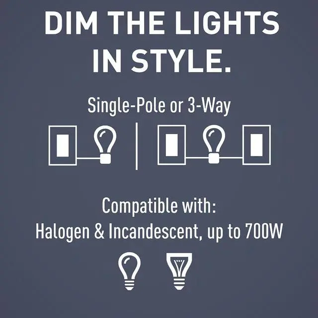 UPGRADE YOUR SWITCHES: Get rid of your ordinary switch to a dimmer with on/off rocker switch and separate slider for dimming. 3-way; control one light from two locations. For use with incandescent and halogen bulbs.