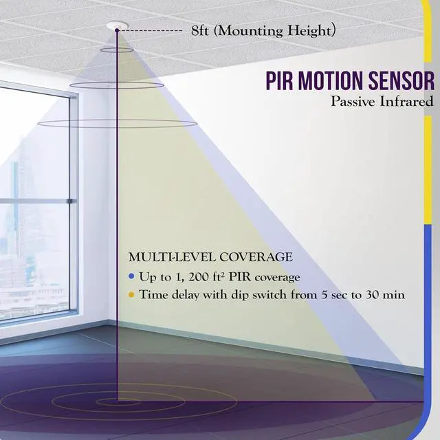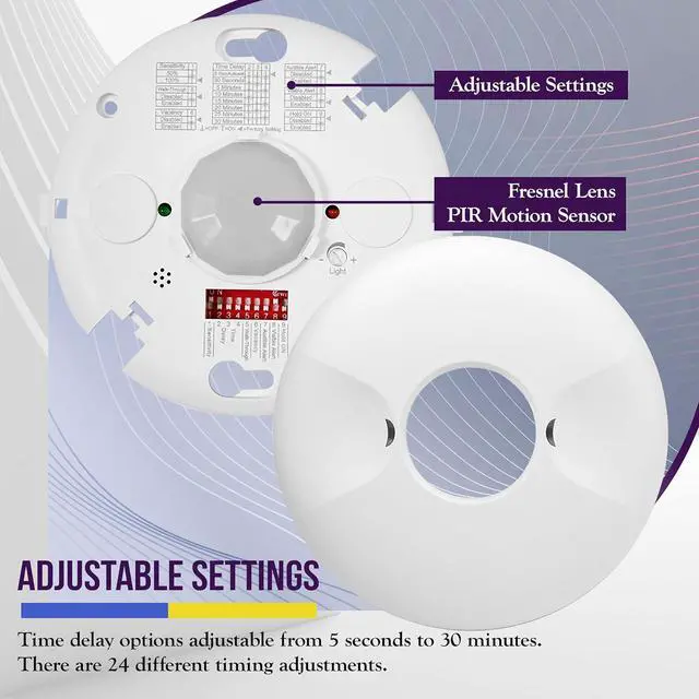 Passive infrared/ pir motion sensor technology. Ceiling mount sensor features adjustable time delay with dip switch from 5 sec to 30 min. Adjustable sensitivity from 50% - 100%