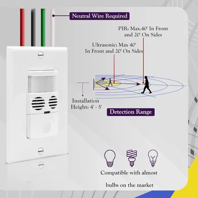 Customizable settings, such as adjustable time delay, detection range, light level. Change between occupancy/vacancy modes and set different PIR/ultrasonic trigger modes and levels