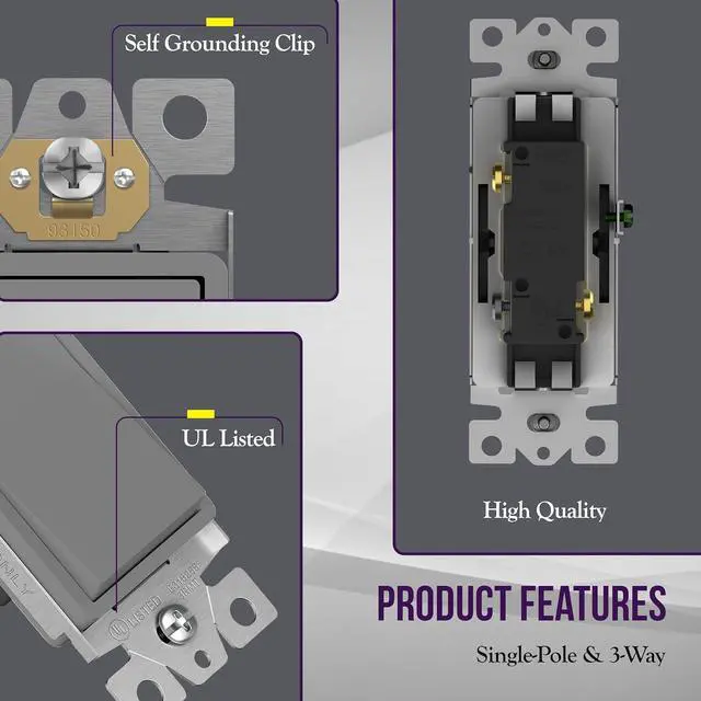 Shallow body design fits standard junction boxes. Back insert and side terminal wiring (copper only). Break-off plaster ears. Grounding screw