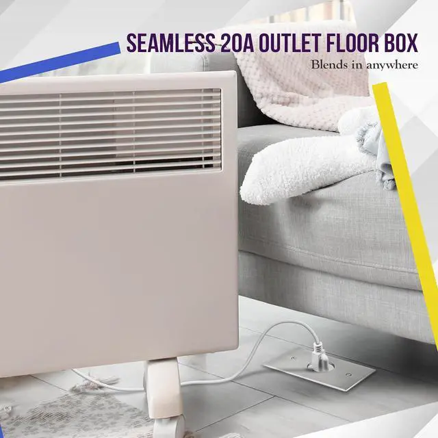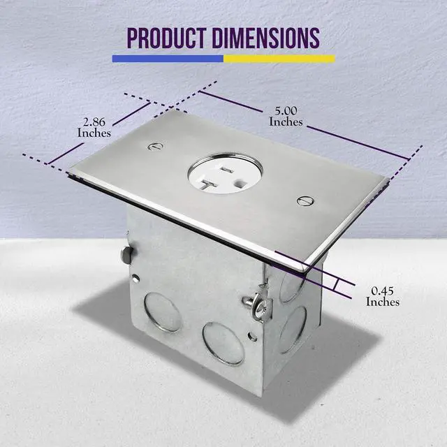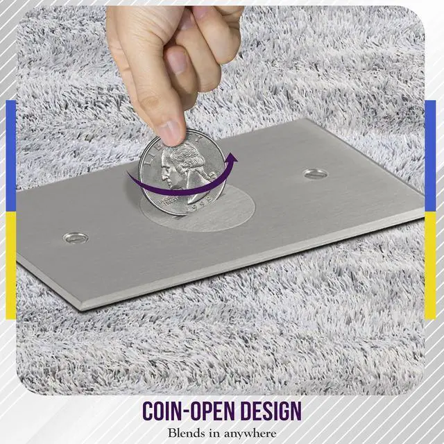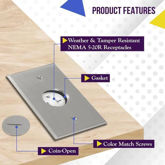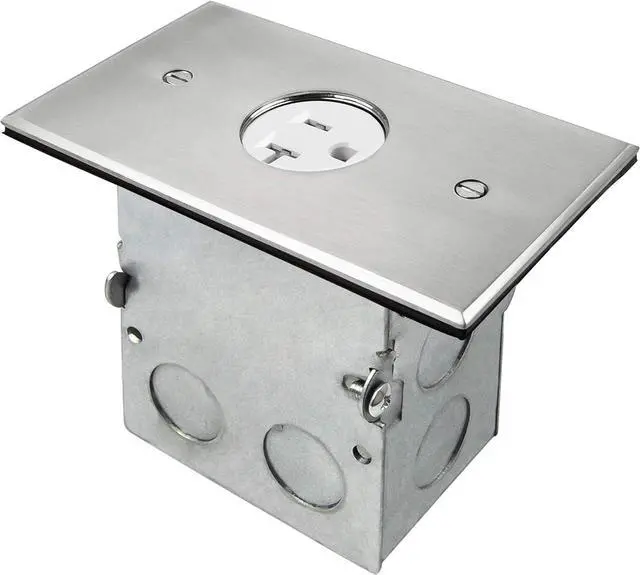 Floor box kit: includes a hard material stainless steel coin open cover floor box with screw-in outlet windows, single 20A tamper resistant receptacle