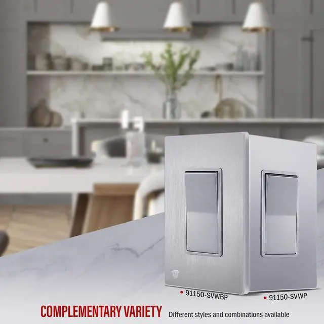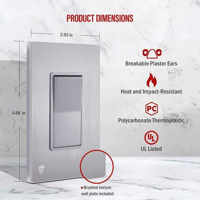 Superior design decorator outlets from our Elite Series; outlet face has a smooth and matte metallic-colored finish; includes matching brushed texture, screwless wall plate (ENERLITES model SI8831-BSV) with a child-safe design, wall plate dimensions: 4.75" x 2.93"