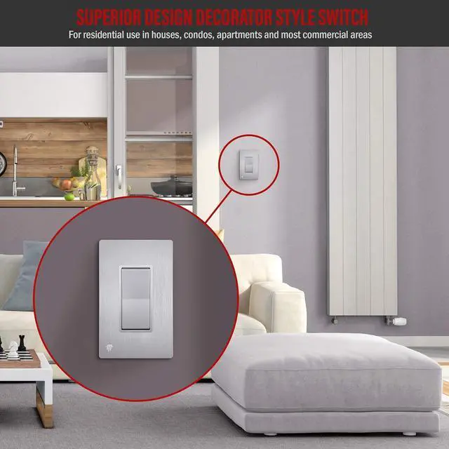 Attractive, modern decorator style light switch for residential use in houses, condos, apartments, and many commercial areas such as offices, hotels, and high-end businesses