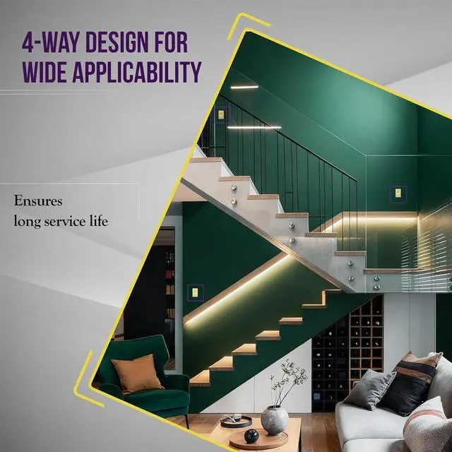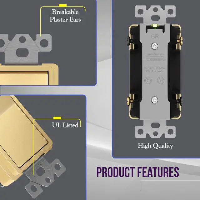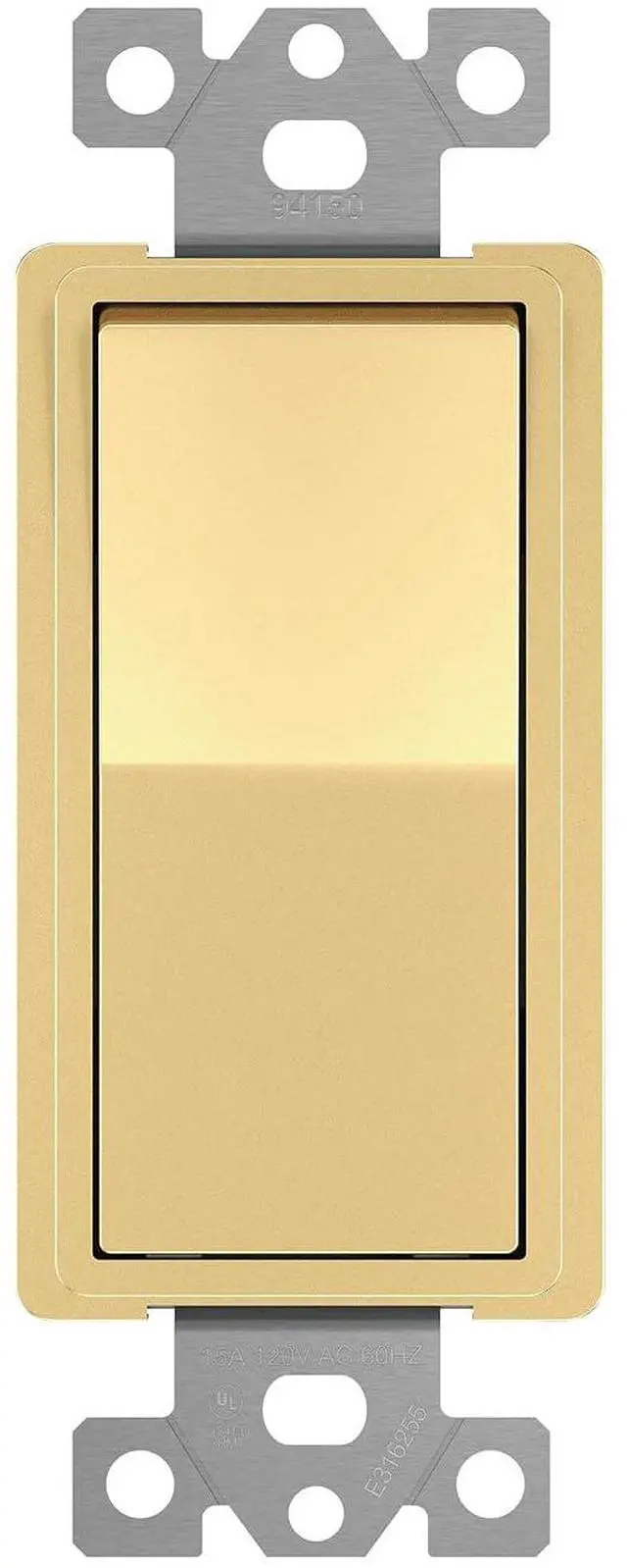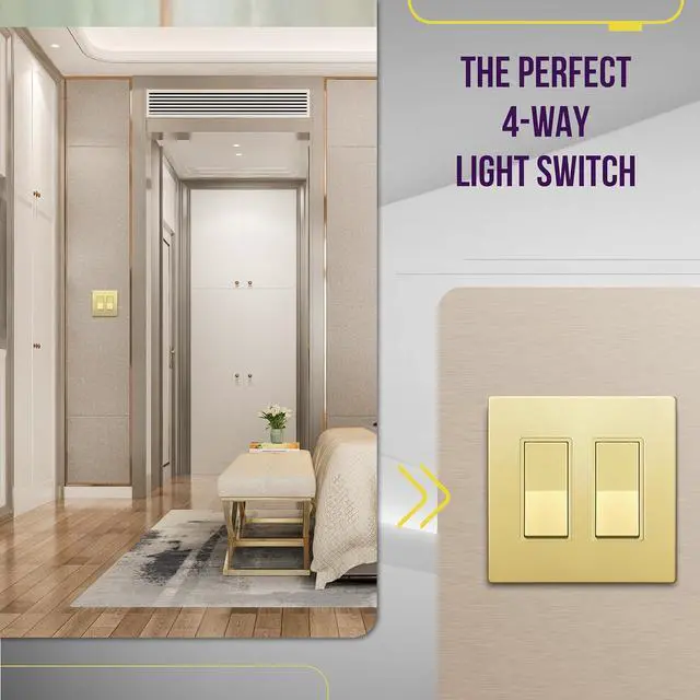 Gold color; 15A, 120V-277 VAC; compatible in 4-way applications only; requires two 3-way wall switches (sold separately); push-in or side wiring (#12-14 AWG copper only); wiring instructions included; 1-year warranty; UL Listed