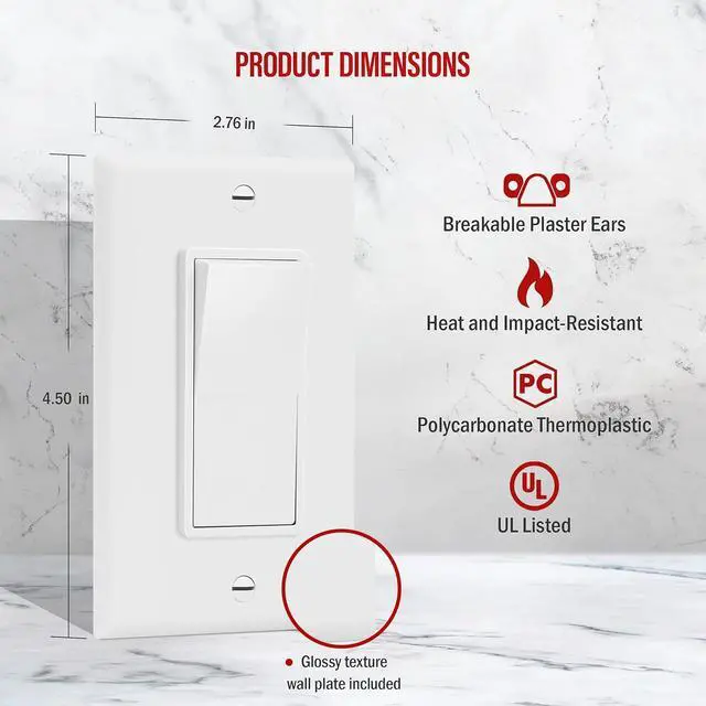 Specifications: universal 15A 120v-277v (ac only) single pole rocker/paddle light switch. Standard size wall plate measures 4.50" height x 2.76" width