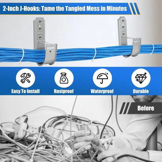 • Broad Compatibility - 2 inch cable j hooks are designed to securely organize a wide range of cables including CAT5e/6/6A, coaxial, and fiber optic cables from 0.5" to 2" diameter, as well as conduit, ensuring perfect compatibility for both current and future cable management needs