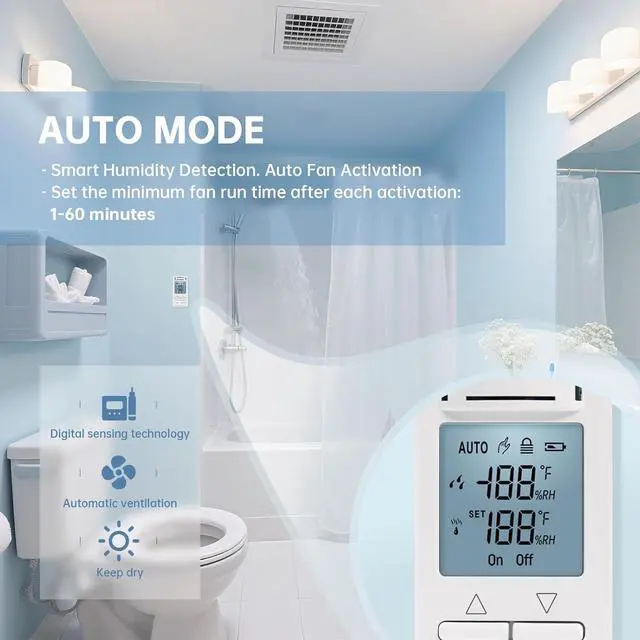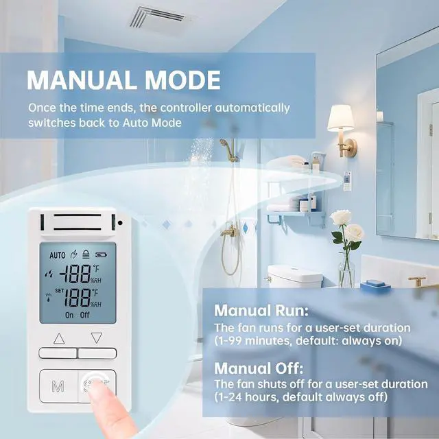 • Auto mode function: support both automatic and manual modes. In automatic mode, the controller intelligently detects ambient humidity and automatically turns the fan on or off. You can set the fan run time from 1 to 60 minutes to maintain a consistently dry environment