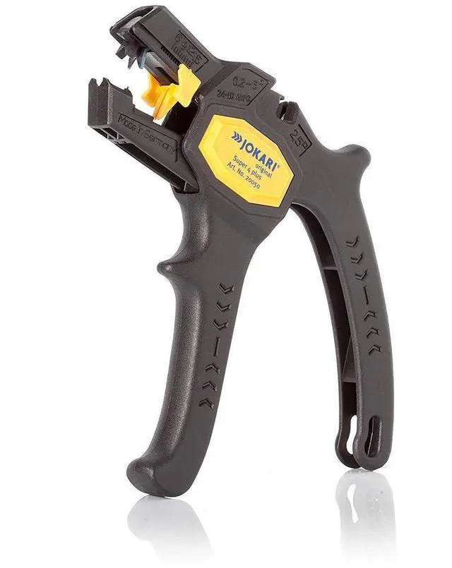 Wire cutter for cross sections up to AWG 14 (2.5 mm²) Adjustable length stopper and a plier handle design with lockable grip Spare blades available. Original JOKARI quality Product made in Germany
