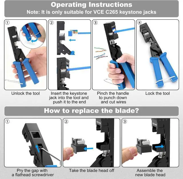 ONLY FOR VCE'S C265 90° KEYSTONE - The keystone termination tool is designed for VCE's C265 series keystone jacks, including 90° CAT6/CAT6A keystone jacks which are UL-Listed and slimmer than traditional ones. Great for fitting side by side into multi-port wall plates (decora plates) or patch panels.