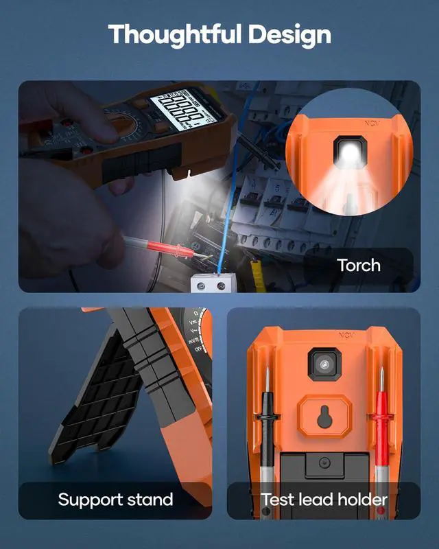 Four-layer hole, supporting stand and the design of the test lead holder ensures more convenience: this multi-function meter helps users to fully focus on the electrical retrofittings, repairs and maintenance.