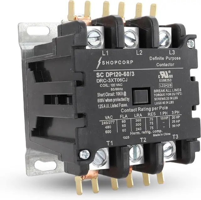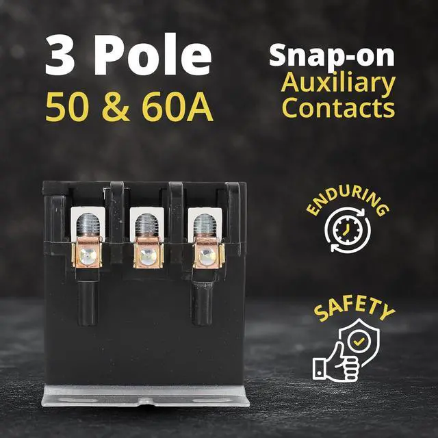 HVAC Contactor Durable, Quiet, and Versatile: Designed for HVAC, refrigeration, and heat pump systems, this 3-pole contactor delivers silent operation and dust resistance. Rated for 60 amps at 120V, ideal for residential, commercial, or industrial environments.