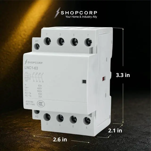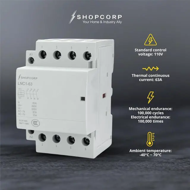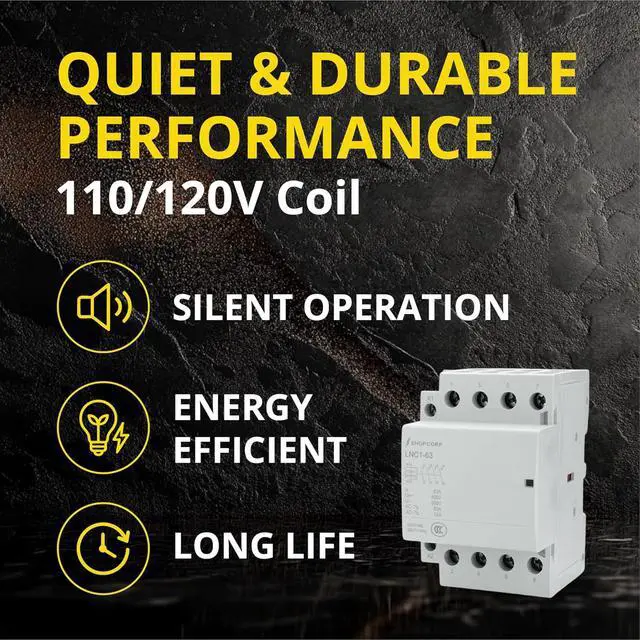 Contactor 120v coil 63Amp 4 Pole Normally Open (NO) AC contactor for home and industrial uses with 110/120VAC coil. Compatible with 35mm DIN rails and equipped with a power status indicator. Complies with IEC/EN standards for consistent and reliable installation. Ideal as a compressor contactor.